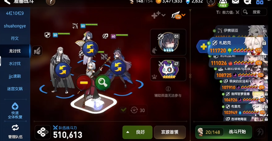 养成优先级上,水扇技能需优先点满被动与一技能,专属装备推荐选择一技能增伤。开水哥技能需达到016以缩短破甲冷却,水奶仅需基础生命套与减伤神器即可胜任。该阵容平均耗时约1-3分钟,适合中后期玩家速刷,但需注意龙13对装备词条的要求较高,初期建议从龙11过渡以积累合格的速度与命中套装。