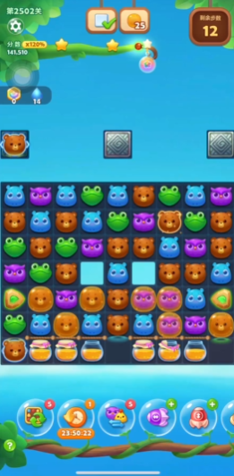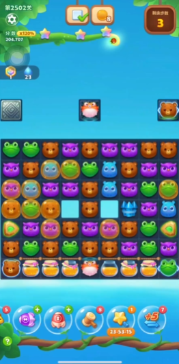 这一关主要任务是消除冰雪覆盖物并收集金豆荚,难点在于冰雪层数较多,普通三消很难快速清理。建议优先从底部开始消除,这样能利用下落动物自动填充的特性,更容易形成连消或特效。开局别急着乱点,观察整体布局,找到能触发连锁反应的关键位置。