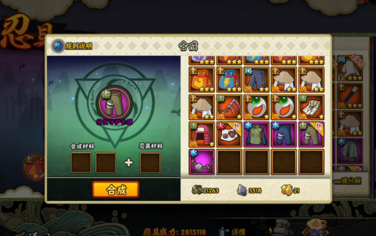 合成时要注意两个细节:一是必须使用未强化的紫色或橙色品质忍具,低品质忍具无法参与合成;二是合成部位完全随机,比如用戒指可能合出刀或护额。建议前期先囤积材料,等拿到核心套装再集中强化,避免浪费符石等珍贵资源。洗炼功能可以优化忍具属性,但洗炼符获取难度较大,优先保留给究极忍具使用。