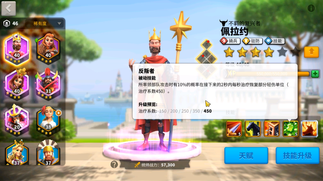 关于技能升级顺序,建议优先把一技能和二技能点满,这两个是核心输出和增益。三技能因为驻防用途有限可以最后点,四技能的治疗效果虽然实用但优先级稍低。5515的加点方案比较均衡,既保证了输出又兼顾生存。觉醒后主要强化二技能的属性加成,整体提升比较线性,不需要刻意追求觉醒。