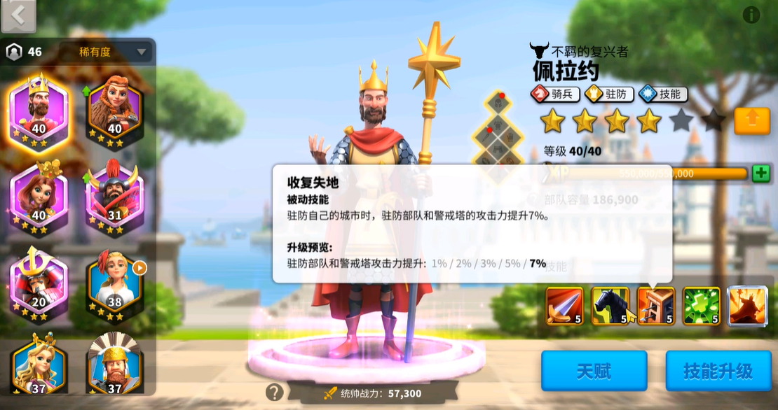 咱们重点说说他的驻防被动收复失地,虽然技能描述写着能提升驻防部队和警戒塔攻击力,但实际用起来会发现他并不适合长期守城。这技能更多是应急用的,比如主力武将外出时临时顶班。真正想玩驻防流派的话,建议还是选孙武这类专业守将。佩拉约的优势还是在野战,特别是搭配骑兵队能发挥最大价值。