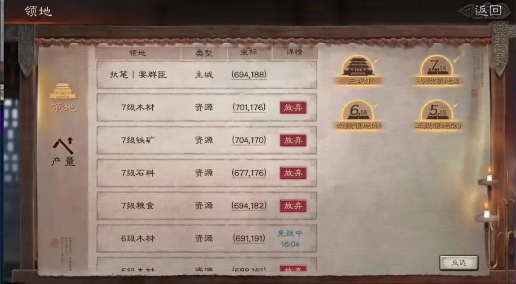 当领地数量达到上限时,可以通过放弃低级资源地来腾出空间。放弃领地后需要等待10分钟才能彻底清空该地块,之后就能占领更高级的土地。建议优先放弃一级或二级地,这些低级地块提供的资源量较少,后期几乎无法满足发展需求。提前规划好要放弃的地块,一次性多拆几个,避免频繁等待冷却时间。