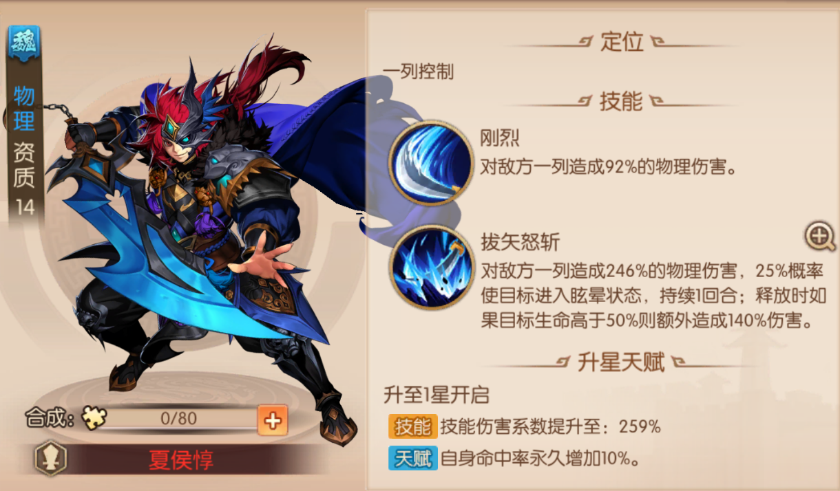 魏国武将的合击技能是阵容构建的关键要素。张辽与张郃组合可降低怒气消耗并压制敌方行动,夏侯惇与夏侯渊搭配能提升40%击晕概率,在第一回合就能建立控制优势。乐进虽无合击效果,但对低血量目标有额外伤害加成,可作为补刀武将使用。需魏国阵容普遍存在防御薄弱的问题,建议通过神兵和站位调整弥补这一缺陷,例如将手戟配备给前排武将以提升残血防御能力,古锭刀则适合收割型武将增强输出效率。
