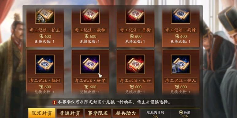 限定封赏每个赛季仅能选择一件商品兑换,主要提供武器、坐骑相关的考工记注等强化道具,建议优先兑换武器类道具以提升主力阵容的实战效果。普通封赏允许在兑换次数耗尽前多次兑换,初期可考虑选择粮食资源加速发育,后期则根据战法点或装备材料需求灵活调整。赛季限定需在新赛季开启10天后开放购买,且仅能兑换一次,其兑换的宝物会在赛季结束时清除,但PK自选赛季中可重新兑换。