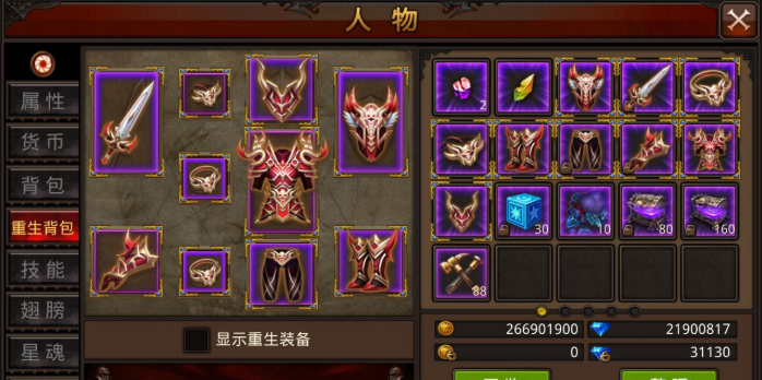 重生后的核心玩法集中在重生大陆,这里不仅有全新的地图和怪物,还有专属的装备系统。重生装备共有十件,包括戒指、项链、圣物、头盔等,它们没有职业限制,但需要满足重生阶数和等级要求才能佩戴。装备的品质分为蓝色、紫色和紫闪,分别对应4条、5条和6条卓越属性。进阶装备需要消耗重生淬炼点、锻造点和涅槃点,进阶后能大幅提升战力。记得多参与重生BOSS的挑战,击败它们有机会获得高品质的重生装备箱和宝石袋。