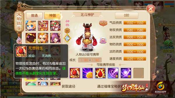 北斗神驴作为梦幻诛仙手游中物理输出型神兽的代表,其核心优势在于1580的超高物攻资质与1520的速度资质,配合专属技能无想转生可形成高效连击机制。该技能触发概率为35%,追加62%伤害结果的相同攻击,虽单次收益低于普通连击,但结合被动技能叠加后能显著提升爆发上限。物理技能如剑荡八荒、血腥狂暴等均可触发连击效果,需优先保留该技能并围绕其构建输出体系。