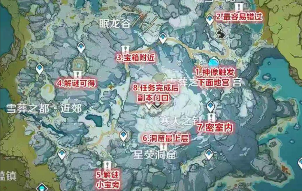 初始石碑位于山洞内,其余七个分布在龙脊雪山各处,包括星荧洞窟西侧、眠龙谷遗迹重机附近等。每激活一个石碑会点亮对应字符,需全部触发才能解除机关封印。部分石碑需先完成环境解谜,例如星荧洞窟的仙灵机关或雪葬之都近郊的坚冰碎片挑战,建议携带火元素角色应对冰属性障碍。