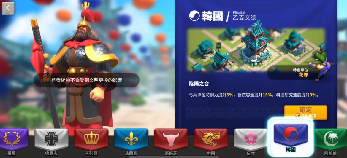 金银宝箱是获取乙支文德碎片的基础途径,通过日常活动、野蛮人讨伐等玩法可获得开启机会。紫雕像作为通用兑换道具,可在特定界面直接换取该武将碎片,但需注意每日兑换存在数量限制。远征商店作为稳定来源,需要持续参与远征玩法积累货币,建议优先保留资源用于定期刷新购买。选择韩国作为初始文明的玩家将直接获得该统帅,但需权衡文明特性与个人发展路线是否匹配。