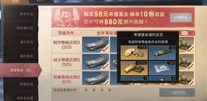 希望基金是咱们在游戏里性价比超高的投资选择,98元的价格能换来大量实用资源。购买后角色成长可以领取多阶段奖励,包括新币、金条、配方残页和联盟信用点等硬通货。这些资源能帮咱们快速提升实力,尤其在前期紧缺阶段非常关键。领取方式很简单,打开福利界面找到希望基金,达到对应等级就能一键领取已解锁的奖励,即使后期补购也不会错过之前的福利。