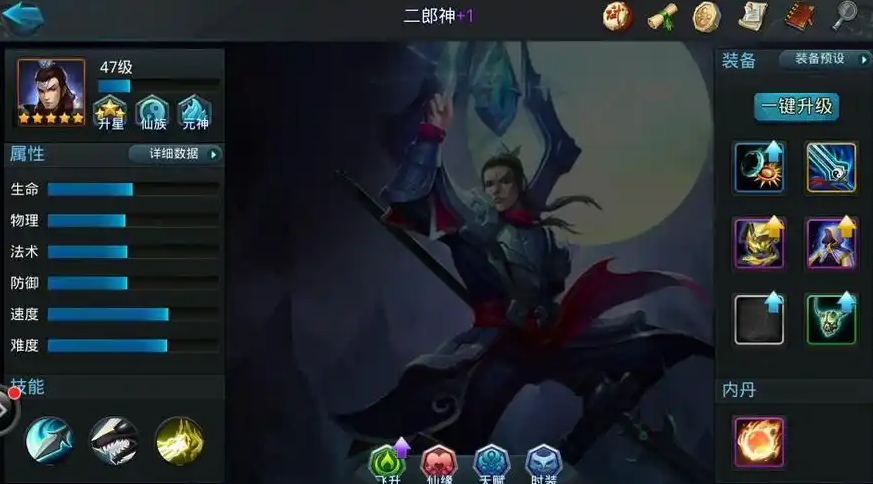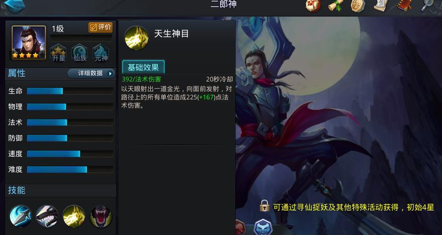 二郎神是一位初始星级就高达四星的仙族战士,属于游戏中比较珍贵和强力的英雄。他最大的特色就是技能伤害类型混合,既有物理伤害也有法术伤害,尤其是他的大招天生神目,是一道超远距离的直线法术光束,伤害非常高,在许多玩家看来简直就是远程收割的利器。