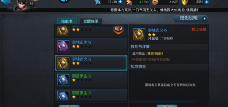 完成觉醒任务后,觉醒技能并不会立即生效,还需要装备对应的技能书来激活。技能书通过参与三界平乱等活动获取,或者在书市使用凌云璧购买。拿到技能书后,还需要用灵气材料进行喂养,以提升升星值。技能书的星级从一星到五星分为五个阶段,升星需要消耗三本同星级相同技能书和一本同星级任意技能书,并搭配对应星级的升星符,如初期的绿霄符和蓝霄符,以及后期需要的紫霄符和金霄符。每次升星成功后,技能效果会得到显著增强。