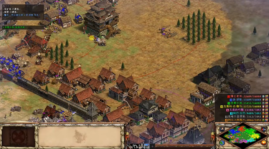 升级到封建时代的硬性条件是积累500食物,这是整个黑暗时代经济运营必须围绕的核心目标。初期必须优先确保食物储备充足,因此需要合理安排村民的工作分配,将绝大多数劳动力投入到食物采集上。通常开局应安排6-8名村民专门负责狩猎羊、鹿或野猪,同时派遣侦察骑兵尽快探索周边区域,将发现的野生动物引至城镇中心附近,以提升采集效率并保障村民安全。木材作为支撑后续建造的关键资源,在确保食物采集点稳定后,需要分配约4-5名村民进行砍伐,为建造磨坊、伐木场和后续的农田做准备。