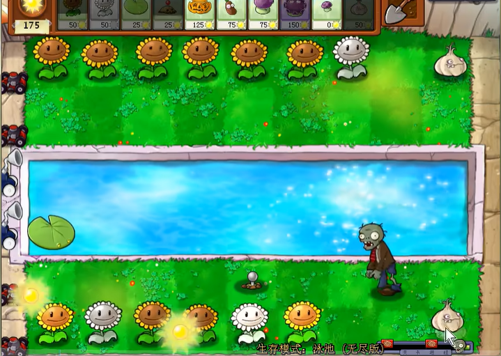 游戏开局需要快速种植向日葵建立阳光经济,土地的后几排和泳池的前几排是种植向日葵的理想位置。在向日葵成型前,务必利用土豆雷、窝瓜等廉价一次性植物来抵挡最初的几波僵尸,为后续发展争取时间。同时要尽快在水池中种下香蒲来应对早期的气球僵尸,保护你的阵型上空安全。第一关结束时,你应当已经拥有相当数量的向日葵和初步的防御力量了。