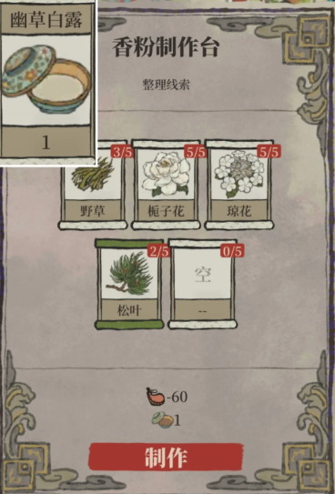 除了日常盈利,香粉在一些限时探险活动中扮演着不可或缺的角色。例如在万花会等活动中,玩家需要根据活动提供的线索或笔记,找出正确的香粉配方并成功制作出指定香粉,才能解锁后续剧情或完成任务目标。像琼花玉树、连翘入暮等配方都是为此类活动准备的,制作它们需要消耗琼花、连翘、百年老木等多种特定材料。
