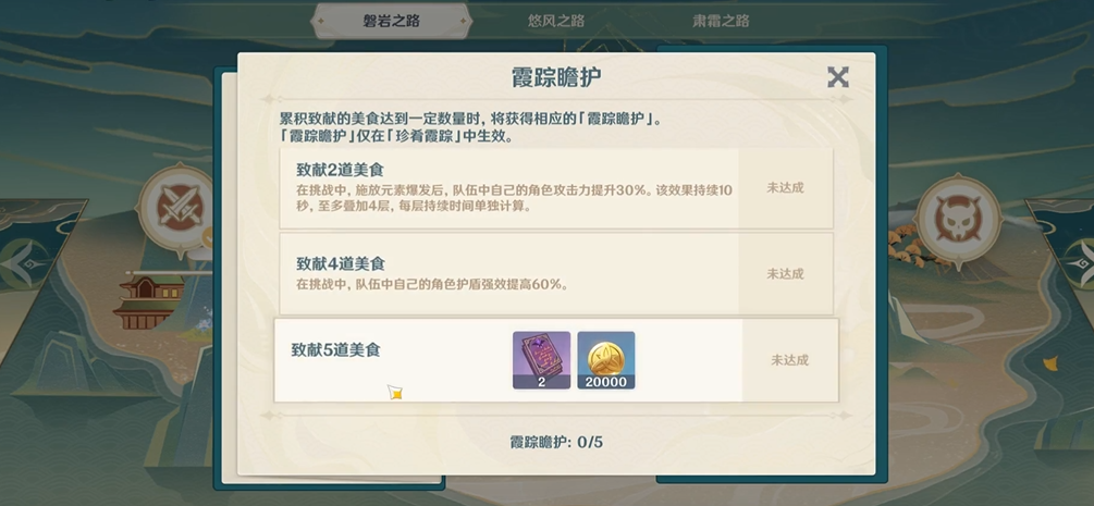 霞踪瞻护的增益效果只在当前挑战区域生效,所以每次进入新区域前都要重新提交美食。提交的美食数量不同,获得的增益也会变化,比如提交两道菜品能提升攻击力,提交四道能增强护盾效果。建议提前准备好足够的美食,尤其是高品质料理,这样能最大化增益效果。挑战过程中,敌人首领会在血量降到30%时触发回血机制,所以最好集中火力快速击败他们,避免拖长战斗时间。
