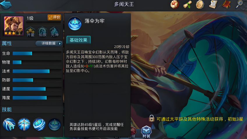 多闻天王作为仙族辅助型英雄,其核心优势在于提供团队防护与控制效果。技能宝伞虚影可召唤幻影拉扯敌人,混元妙灵能为队友施加护盾并降低所受伤害,宝伞镜像则通过旋转发射水滴造成法术伤害与减速。天赋飞云润伞和混元爆垒进一步强化法术强度与范围伤害,使其在正面对战中能有效限制敌方行动。与持国天王、哪吒等英雄触发仙缘时,可提升基础生命值或法术强度,增强团队协同作战能力。