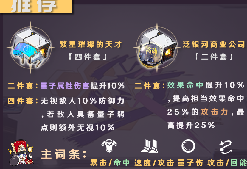银狼作为量子属性的虚无命途角色,其核心机制在于通过弱点植入和减防效果为团队提供战略价值。遗器搭配需围绕效果命中、速度及输出能力展开,优先保证功能性再考虑伤害提升。量子四件套繁星璀璨的天才与泛银河商业公司两件套的组合是最优解,前者提供量子伤害加成和防御穿透,后者增强效果命中并转化为攻击力加成。若效果命中达标(满级银狼约68%),可将内圈遗器替换为停转的萨尔索图以强化暴击收益。