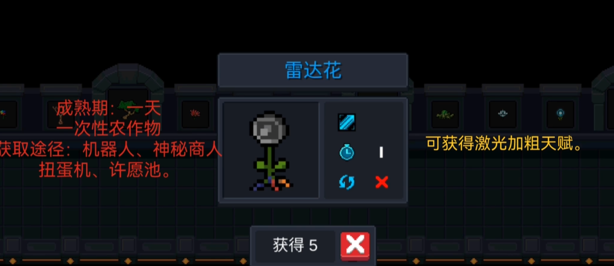 雷达花是唯一能直接增加激光宽度的植物。这种一次性植物成熟后可提供激光加粗天赋,效果包括提升激光武器的光线宽度、免疫感电异常,并对部分武器有固定伤害加成。雷达花成熟周期为1天,收获后消失,需通过机器人、宝箱、商人或扭蛋机等途径重新获取种子。其核心价值在于显著增强激光类武器的实战表现,尤其是对光剑系列、单发激光枪等武器有额外伤害提升。