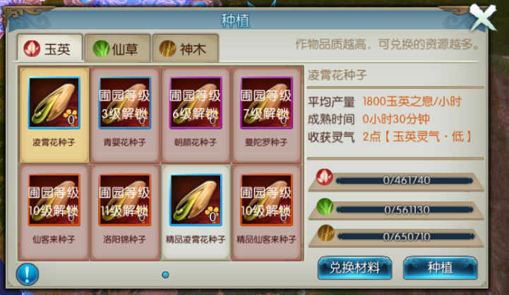 仙府升级后解锁更多装饰区域与高阶种子种植权限,圃园数量随等级提升而增加,最高可同时放置五个圃园。种子成熟时间从30分钟至12小时不等,照料作物可提升基础材料产量,这些材料用于提升玉英之息、仙草之灵、神木之气三种仙府升级要素。特殊材料作为伴生产出,其获取概率与品质成反比,紫色材料通常需多次收割才能获得。