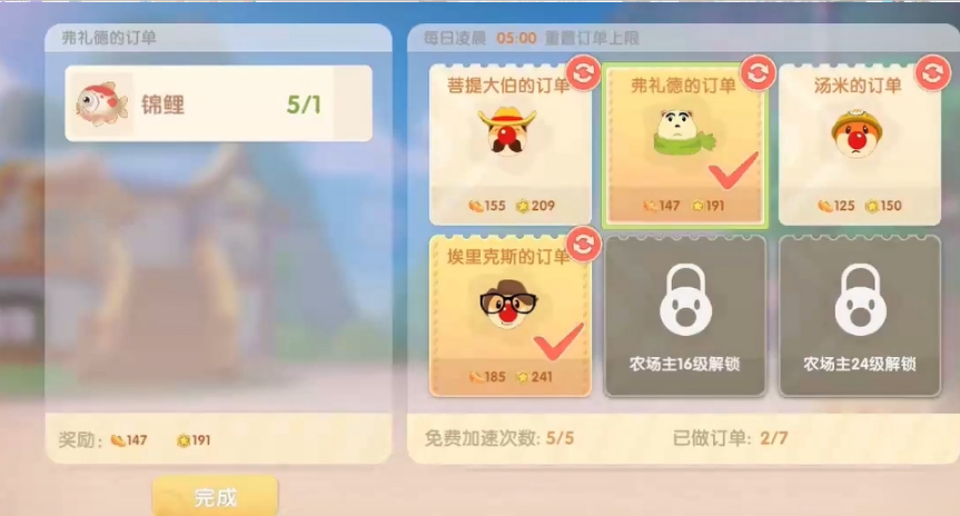 农料获取与农场等级密切相关,不同等级的解锁内容直接影响可购买的种子和饲料种类。通过收获农作物、清理杂草石块、完成钓鱼订单等基础操作均可积累农场主经验值。种植作物必须完成收获才能获得经验,提前规划作物生长周期与订单需求的匹配度尤为重要。夜间种植生长周期较短的作物,次日即可收获,这种时间管理方式能显著提升经验获取效率。