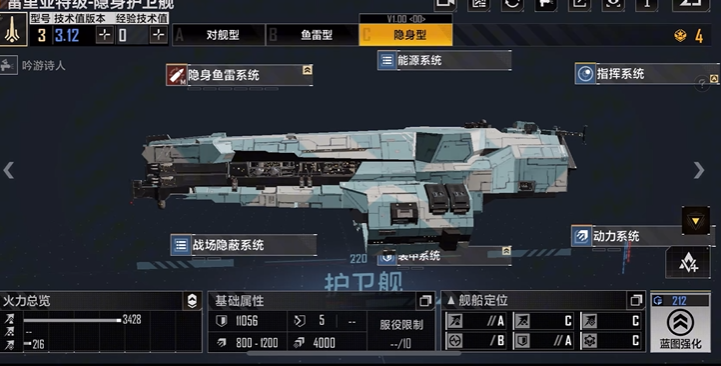 隐身型的加点路线就完全不同了,它装备的是隐身鱼雷系统,单发伤害能达到286点,比基础型高出一个档次。优先把冷却时间和武器伤害点满,然后是命中率和暴击率。别忘了它的战场隐蔽系统,适当点出隐身能力能大幅提升生存率。这种型号的站位比较灵活,中后排都能胜任,主要看你的舰队配置。隐身型最大的优势是能专门针对战巡发动攻击,策略技能还能额外提升25%输出,在后期战斗中依然有不错的表现。