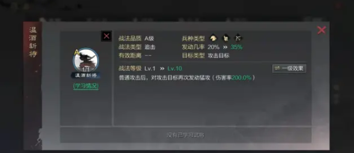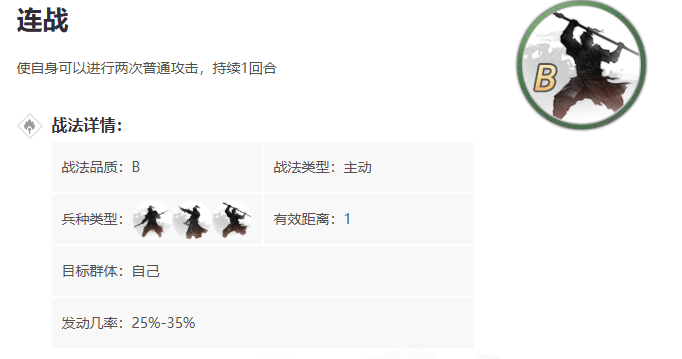 搞定了获取和研究,接下来就是考虑把它给谁用以及怎么用了。连战这个战法的效果简单粗暴,就是让你的武将在发动的那一回合里可以进行两次普通攻击。这就意味着,你最好把它给那些攻击力成长高的物理系武将带上,这样才能把两次普攻的收益最大化。骑兵、步兵、弓兵其实都能带,但因为它核心是打普攻,所以有些玩家会觉得给骑兵这样机动性高的兵种可能节奏更快。你给它升级也是很有必要的,升满级之后,它发动的概率会提高,用起来就更稳定一些。