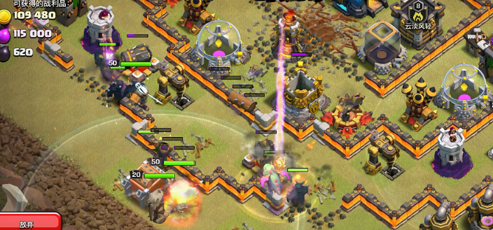 进攻发起时,应利用少量部队或英雄进行清边和吸引火力,有策略地触发天火防御的第一次攻击,为后续主力创造安全窗口。主力部队的投放必须遵循分散原则,避免扎堆,并时刻准备使用冰冻法术精准控制天火防御塔。当部队接近天火防御建筑时,配合狂暴法术加速摧毁是常见手段。保留部分机动兵力用于收尾和清理残余建筑,可以确保在主力承受天火攻击后仍能完成进攻目标。整个过程中,对法术释放的时机和位置需要有精准的预判。