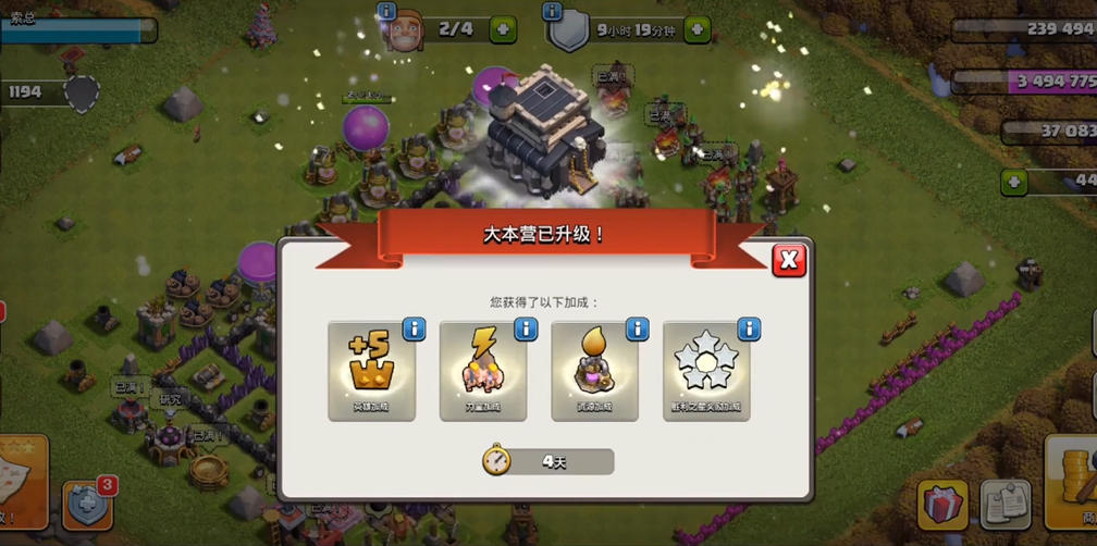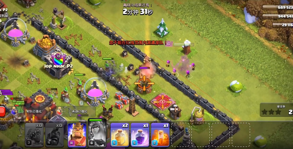 超级蓝胖流以超级巨人与蓝胖为核心输出,搭配少量法师与弓箭手完成清边,天女前戏处理防空与援军后,主力部队从单侧推进,狂暴法术放大范围伤害,快速拆毁多层防御与墙体,冰冻法术控场关键防御,治疗法术维持前排血量。该流派对密集阵型压制力极强,推进节奏快,无需复杂走位,适合追求速战速决的玩法,搭配冰人与武神可进一步提升容错率,清理完核心防御后,剩余部队可轻松完成收尾,兼顾摧毁率与资源获取。