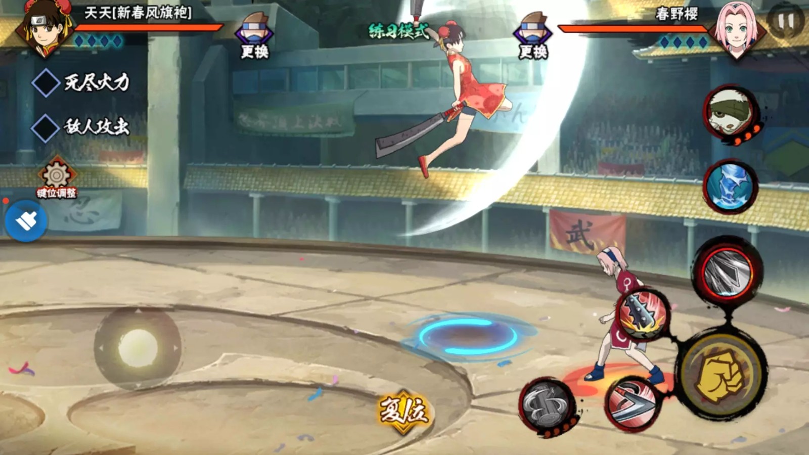 实战中需先把控与对手的身位距离,保持一个身位至两个身位的间隔,先释放二技能影分身,让分身完成前冲动作但暂不触发最终伤害,紧接着开启奥义,利用奥义全程无敌帧覆盖自身后摇,同时影分身的交叉攻击与后续判定会在奥义动画期间命中对手,完成第一颗奥义点的获取,此阶段需避免距离过近导致分身快速打完伤害,也不能过远让判定脱离奥义覆盖范围,中场位置成功率最高,墙角可借助墙体反弹延长技能存在时间,进一步提升蹭豆稳定性。