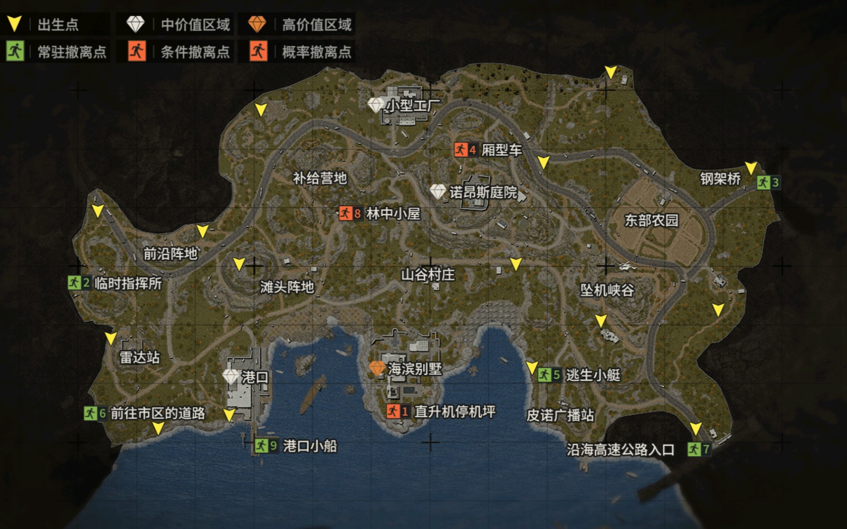 农场回收站警卫室处于回收站东北侧,是一栋三层木屋,内部有办公抽屉、蓝领工装、旅行包等容器,固定刷新基础医疗用品、小型工具与普通弹药,偶尔出现普通配件与低级钥匙,周边常刷新普通人机,装备多为基础护甲与入门枪械,清理后可稳定获取基础物资,适合前期跑刀与资源积累。军港行政楼东侧警卫室需警卫室钥匙开启外门,内部无额外锁具,包含一件衣服、一个旅行包,物资密度较低,主要刷新杂物、少量药品与基础耗材,因位置偏僻、人流量少,常作为跑刀路线的补充点位,可快速搜刮后撤离。电视台停车场警卫室位于地图左侧区域,内部有专业工具箱、置物箱与外套,高概率刷新维修工具、基础配件与少量电子零件,周边通道复杂,适合静步摸取后快速转移,避免与核心区域的玩家队伍遭遇。
